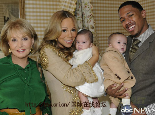 自從瑪利亞·凱利在今年4月產下龍鳳雙胞胎以來就一直盡力躲避公眾的視線。但是凱利的雙胞胎夢露和摩洛哥將迎來首次公開亮相,一家4口近日接受了芭芭拉·沃爾特斯的采訪。此次兩位雙胞胎亮相,粉嫩可愛的小寶寶身穿黃色嬰兒服,從膚色到長相都和爸爸 Nick Cannon極其相似。