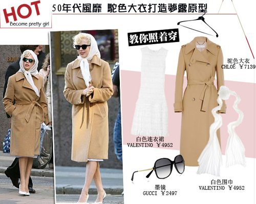 近期大熱的電影《我與夢露的一周》中,米歇爾·威廉姆斯(MichelleWilliams)給我們重現了夢露的經典造型。其中,這套身著脫色外衣、頭戴白圍巾的50年代裝扮讓大家記憶深刻。一件簡單的駝色大衣,一條圍巾搭配一架墨鏡,露出纖細小腿配雙小細跟鞋,如果你也想嘗試下復古的感覺,那千萬不能錯過
