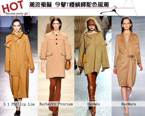 優雅、奢華、大氣的大地色調橫掃各大秀場。Phillip Lin、BurberryProrsum、Hermes、MaxMara等大牌時裝秀場上我們都看到了駝色大衣的身影。各個深淺層次不一的駝色系看起來都是那么的惹人喜愛