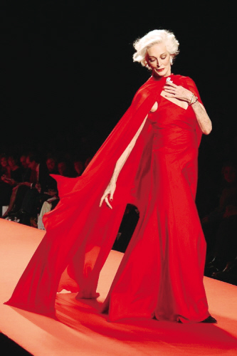 很難想像擁有這樣優美曲線的主人竟是年近八十的卡門·戴爾·奧利菲斯,她自十多歲投身模特界, 在T臺上一走就是六十多載。幾十年來,卡門一直是大師和大品牌的寵兒,曾為Herms處女秀走秀,為Dior壓軸鎮場,還頻繁在國際時裝周上亮相。勞力士腕表、服裝品牌GAP、雅頓面霜、蘭嘉斯汀抗老系列、Target百貨公司等都邀其代言,看中的就是卡門在時尚界的常青樹形象。