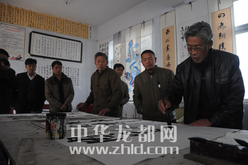????作為距離太康縣城最遠的一個邊界鄉鎮,轉樓鄉的文化活動開展得有聲有色。該鄉依托文化站,成立了在鄉一級少見的文聯,下設書法家協會、腰鼓協會、嗩吶協會等。我們在轉樓鄉政府采訪時,正碰上書法家協會20多名會員在一起切磋書藝。今年74歲的許家榮是鄉書法家協會主席,也是《周口晚報》的老讀者,看到我們到來,老人興之所至,當場揮毫潑墨,為本報題寫了“周口邊界行接地氣有人氣”的條幅。據了解,每逢春節,書法家協會會員都會走村串戶,為村民義務書寫春聯。