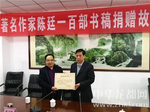 中華龍都網訊(周口報業全媒體記者 李瑞才 通訊員 楊光宏 文圖)4月1日上午,鹿邑籍中國著名傳記作家陳廷一百部書稿捐贈故里交接儀式,在老子故里鹿邑縣委黨校二樓會議室舉行。