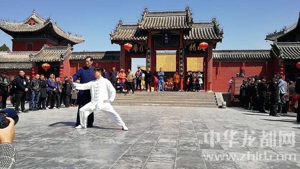 研討會(huì)前,王西安大師率弟子在淮陽(yáng)太昊陵廟太極門前向海內(nèi)外太極拳愛(ài)好者傳授拳術(shù)。