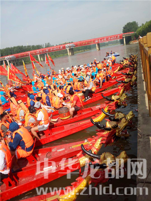 比賽開始前,位于周口大道橋東側(cè)的中華龍舟大賽賽場(chǎng)已是喧聲鑼鼓,人海如潮,不少市民攜家?guī)Э谇皝?lái)觀戰(zhàn)。河中,二十多條龍舟整齊地排列在水面上。