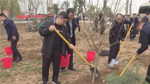 當天下午雖然暖陽照射,但初冬的鹿邑大地仍是涼風習習。不過這一點兒也沒有影響到大家的心情。一到植樹現場,梁建松、李剛等領導就和大家一起興致勃勃地拿起鐵鍬等工具忙碌起來,揮鍬鏟土,扶樹填土,澆水正苗,每道工序都做得認真細致、一絲不茍。