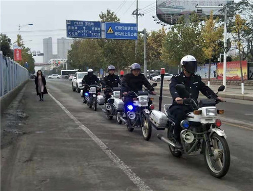 入冬以來,鄲城縣進一步加強治安防控工作,提高快速反應能力,強化震懾效果,提高見警率和管事率,確保巡防無死角,有效預防和打擊各類違法犯罪活動,廣大人民群眾的安全感、滿意度明顯提升。圖為11月14日上午,鄲城縣巡防大隊摩托車隊在城區主街道巡邏。記者 盧好亮 攝