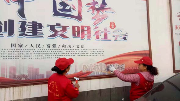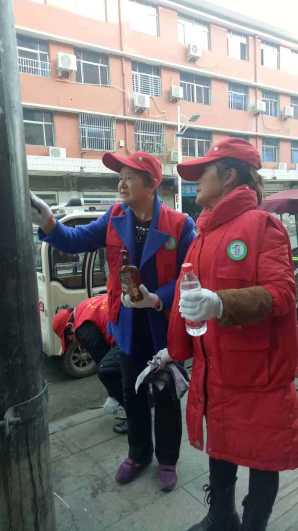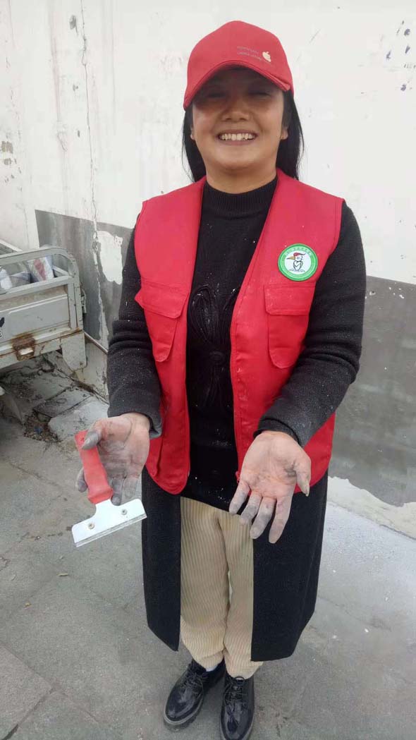 周口市啄木鳥志愿者服務工作委員會臨時黨支部書記、周口市慈孝文化促進會會長孫彩云更是不怕臟,不怕累,連個手套都不帶,直接用雙手拿著鏟刀或者抹布清理墻上的小廣告,最后弄得雙手和滿身都是污漬。“為了我們的城市更漂亮,作為一名志愿者,就應該不怕累,不怕苦。”