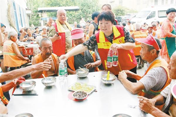 為幫助環衛工做好防暑降溫工作,7月23日,太康縣總工會到該縣“愛心粥屋”看望慰問環衛工人,并捐贈1萬元現金和價值6000元的毛巾、礦泉水。圖為該縣總工會志愿者為環衛工發放礦泉水。