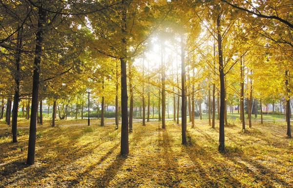 近日,周口市經濟開發區人民廣場,金黃色的楊樹葉在陽光照耀下熠熠生輝,給城市增添一抹亮色。張振海 攝