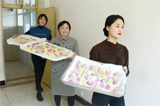 護師趙瑞本不該上班,可她一大早就起床,洗菠菜榨汁、和面,給過周日的孩子留了早飯就匆匆來到醫院;護士長趙鳳英一早打好餡,又榨了南瓜汁和面,帶著來到了單位;護師崔文芳上夜班,她提前準備好火龍果,和成面帶著,下了夜班換上衣服就干開了;護師謝夢媛孩子剛一歲多,身體不舒服,哭鬧不休,也丟給媽媽照顧,匆匆趕到醫院……