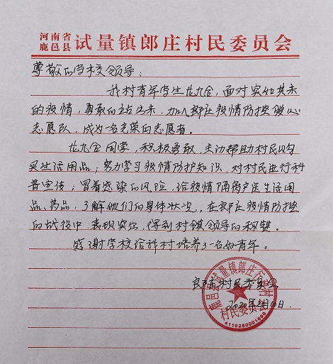 “龍九合同學(xué)積極勇敢,主動(dòng)幫村民購(gòu)買生活用品,努力學(xué)習(xí)疫情防護(hù)知識(shí),對(duì)村民進(jìn)行科普宣傳,冒著感染的風(fēng)險(xiǎn)給疫情隔離戶送生活用品、藥品,在我村疫情防控的戰(zhàn)役中表現(xiàn)突出,得到村鎮(zhèn)領(lǐng)導(dǎo)的稱贊,感謝學(xué)校給我們培養(yǎng)了一名好青年……”這是一封要寄往周口師范學(xué)院的感謝信,落款為鹿邑縣試量鎮(zhèn)郎莊行政村村民委員會(huì)。