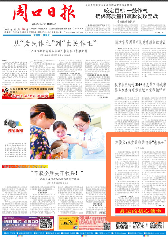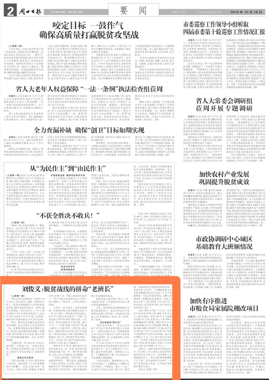 2019年10月18日,《周口日報》頭版轉版,以《劉俊義:脫貧戰線的拼命“老班長”》