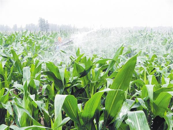 ② 6月4日,沈丘縣周營(yíng)鎮(zhèn)黃孟營(yíng)村農(nóng)民在用小型自動(dòng)噴機(jī)械噴灌春玉米。 謝辛凌 攝