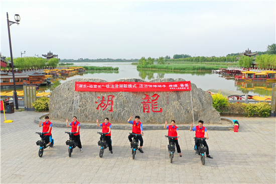 當日38度的高溫酷熱擋不住檢察干警守護淮陽河暢、水清、湖凈、岸綠、景美的決心和信心,30名檢察干警、志愿者騎電車圍湖宣傳,為市民進行相關政策的講解,號召市民熱愛龍湖,告知群眾及社會各界人士參與檢察公益保護的方式和途徑,公開聯系電話,微信公眾號,方便群眾通過多種渠道提供案件線索。