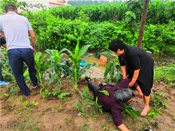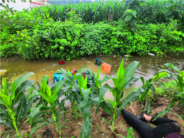 7月26日,連續(xù)多日的降雨已導致農(nóng)村坑滿河平、積水頗深。當日下午4時,依然時雷聲陣陣、雨如豆粒,二人在宜路鎮(zhèn)張寨村小學附近的玉米田間拍照核查“圖斑”時,看到一輛車箱內(nèi)載有幾位老人的電動三輪車冒雨從路邊疾駛過去。緊接著聽到“撲通”一聲,趙文波、李偉二人立即意識到是三輪車掉進路溝、落水了。