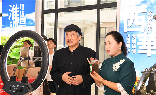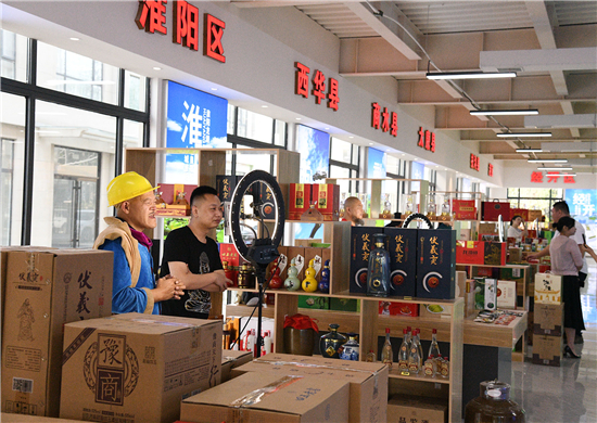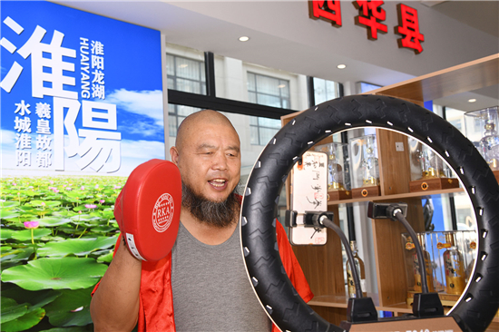 記者看到,川匯區(qū)直播電商產(chǎn)業(yè)基地直播大廳內(nèi),全市各個(gè)縣市區(qū)都在此設(shè)有土特產(chǎn)直播區(qū),川匯區(qū)賣的有伏羲貢酒等,淮陽(yáng)區(qū)賣的泥泥狗、布老虎、黃花菜、健身器具等,西華縣賣的有胡辣湯料等各種土特產(chǎn)。商家們“八仙過(guò)海,各顯神通”紛紛請(qǐng)來(lái)各路網(wǎng)紅大咖們助力直播。川匯區(qū)四五酒業(yè)請(qǐng)來(lái)“光頭強(qiáng)”熱賣四五老酒,西華縣的商家請(qǐng)來(lái)“趙本山”帶貨直播叫賣。