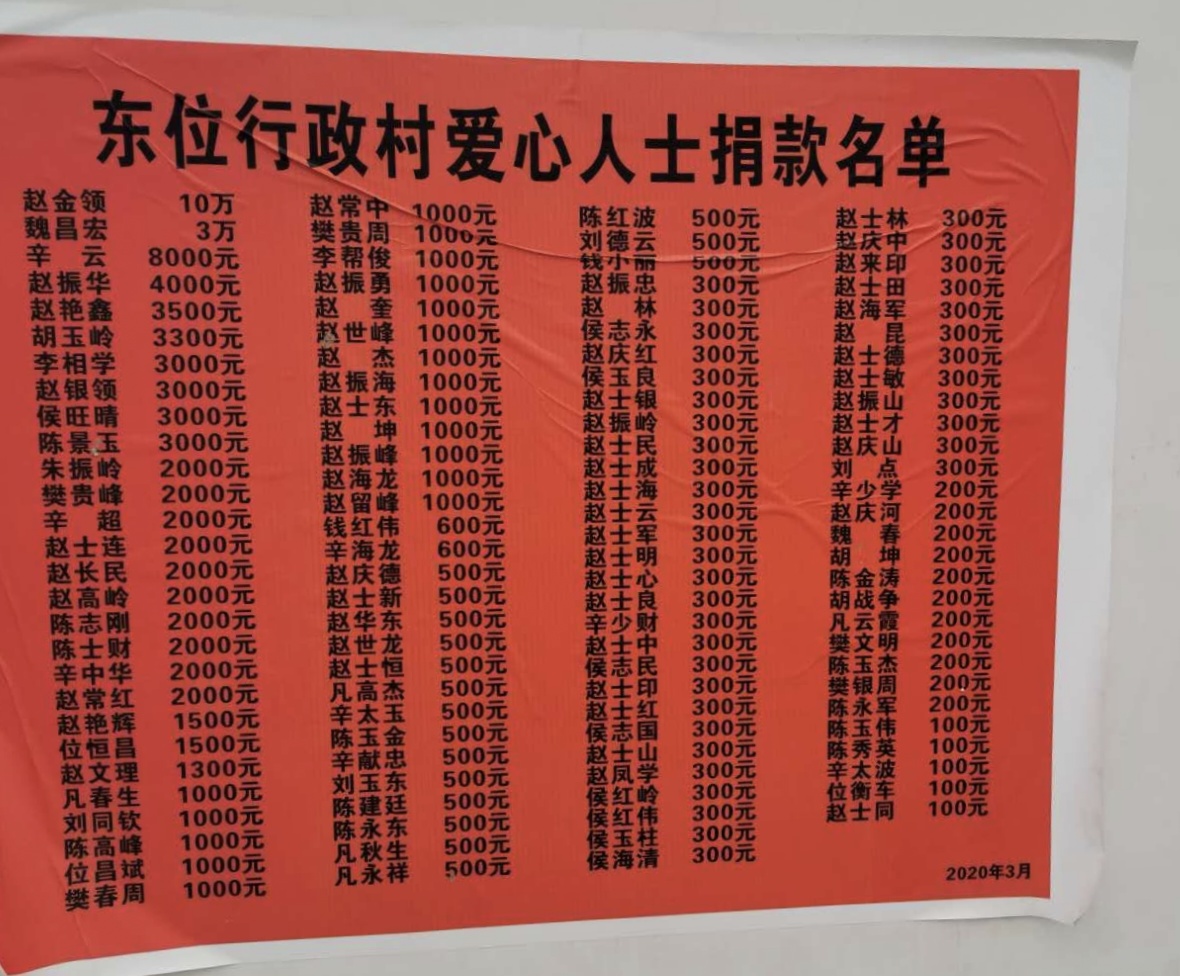 樊玉周向記者展示了兩份成績單:第一份是大家捐款明細。第二份便是鄉賢響應黨委政府號召參與美麗東位建設,為村莊帶來的新變化:實施坑塘改造1處面積300平方,道路硬化810米,硬化胡同5條700米并完善排水管道,綠化面積2600平方米,新建文化廣場3座,實施高標準農田水利建設,溝渠治理2800米,新挖機井45口,旱廁改造率80%以上,自來水、寬帶網絡實現全覆蓋,電網進行了全面改造,9個自然村路燈全覆蓋,趙莊自然村監控全覆蓋……