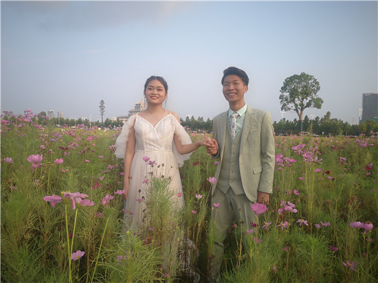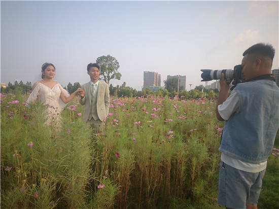 圖為近日,市民在周口大道路邊的草坪上記錄下自己幸福的瞬間。(記者 杜林波攝)