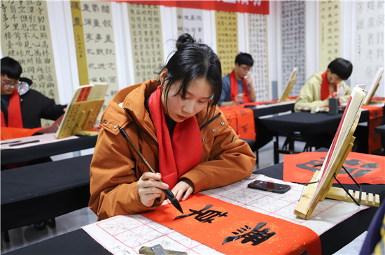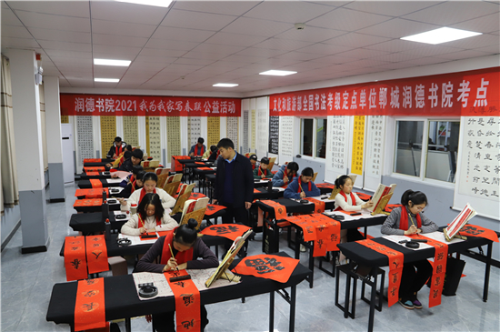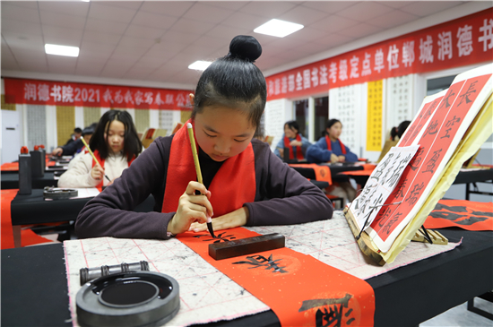 2月3日,記者在鄲城縣潤德書院看到,“我為我家寫春聯”活動正緊張地進行著,數十名書法小學員端坐案前、從容執筆、揮毫作書,一個個福字工整又靈活,一副副對聯娟秀又詩意。孩子們在屋內全神貫注地寫字,把最美好的祝福用自己的所學展示給家庭;家長們在窗外掂腳張望,望子成龍、望女成鳳的心態表露無遺。
