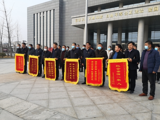 2月4日下午,淮陽區康森木業有限公司、周口裕彩科技研發有限公司等6家企業代表為區優化營商環境專項治理工作組送來了6面錦旗和大量防疫物資,向工作組表達感激之情,對工作組人員高效快捷的工作給予高度贊揚。