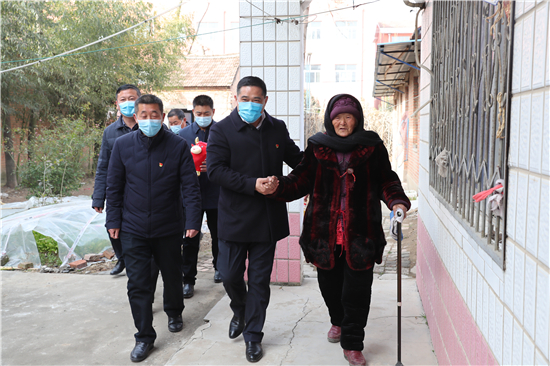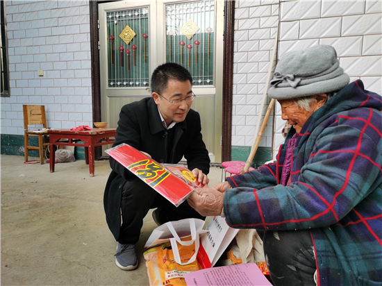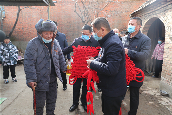 在鄭家集鄉(xiāng)韓樓村,縣農商銀行鄭家集支行行長武繼龍帶領員工來到92歲韓老漢的家中,看到韓老漢由于身體原因只能靠拐棍佝僂著背站著,武繼龍緊忙彎腰俯下身說:“大爺,快過年了,我們來看看您,提前給您拜個早年!”“真的是太感謝恁了,這么冷的天,還讓你們來送到家里面。”韓老漢激動地說。