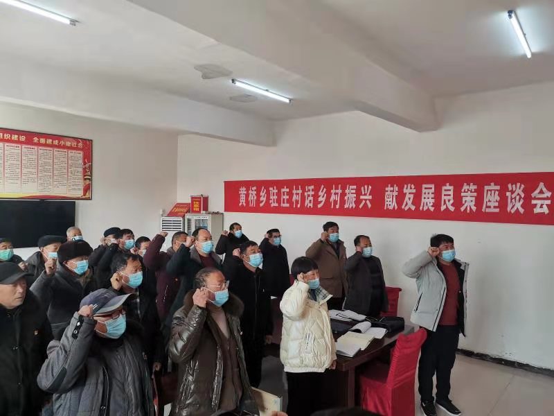 “我志愿加入中國共產黨……”駐莊村黨支部書記劉廣濤帶領與會黨員開展重溫入黨誓詞活動,面對黨旗,舉起右手,黨徽在胸前熠熠閃耀。隨后,以“微黨課”的形式,劉廣濤通報了家鄉變化,駐村第一書記張振芳領學了《習近平調研指導過的貧困村脫貧紀實》,與返鄉黨員們共話振興路,暢談發展良策。