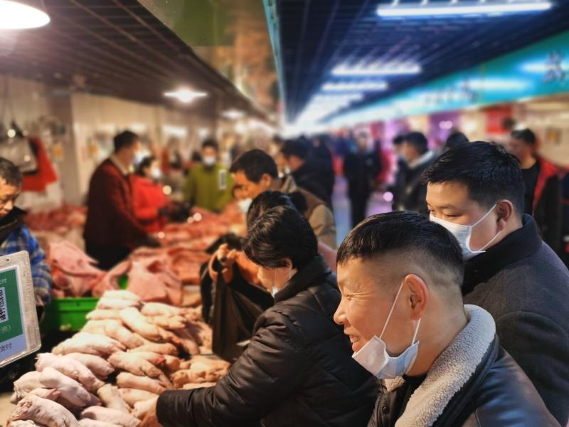 2月10日一大早,位于周口市的最大的黃淮農貿市場里熙熙攘攘,熱鬧豐常,行人小心翼翼地從來往的各式貨車間穿過,客商們被格外熱鬧的攤位吸引,駐足詢價、了解行情。圖為熱鬧的肉類銷售區域內市民在選購。