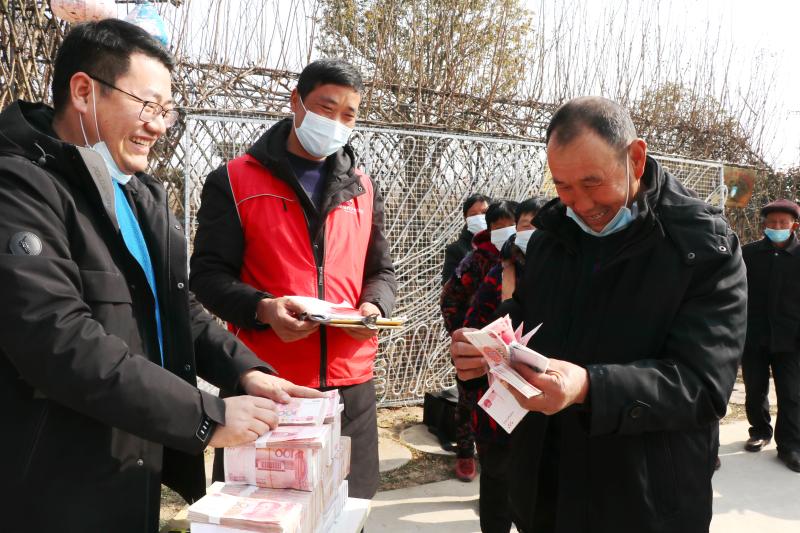 宋傳東、宋建超、王龍、魏端明、張鳳云......村民們領過錢,歡笑著離開現場。當日,合作社向村民們發放了150萬元的租金、工資和分紅。涉及城郊鄉池莊行政村的宋莊、毛莊、王菜園和大于行政村的常莊、楊莊等9個自然村,共計400戶村民。