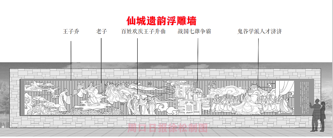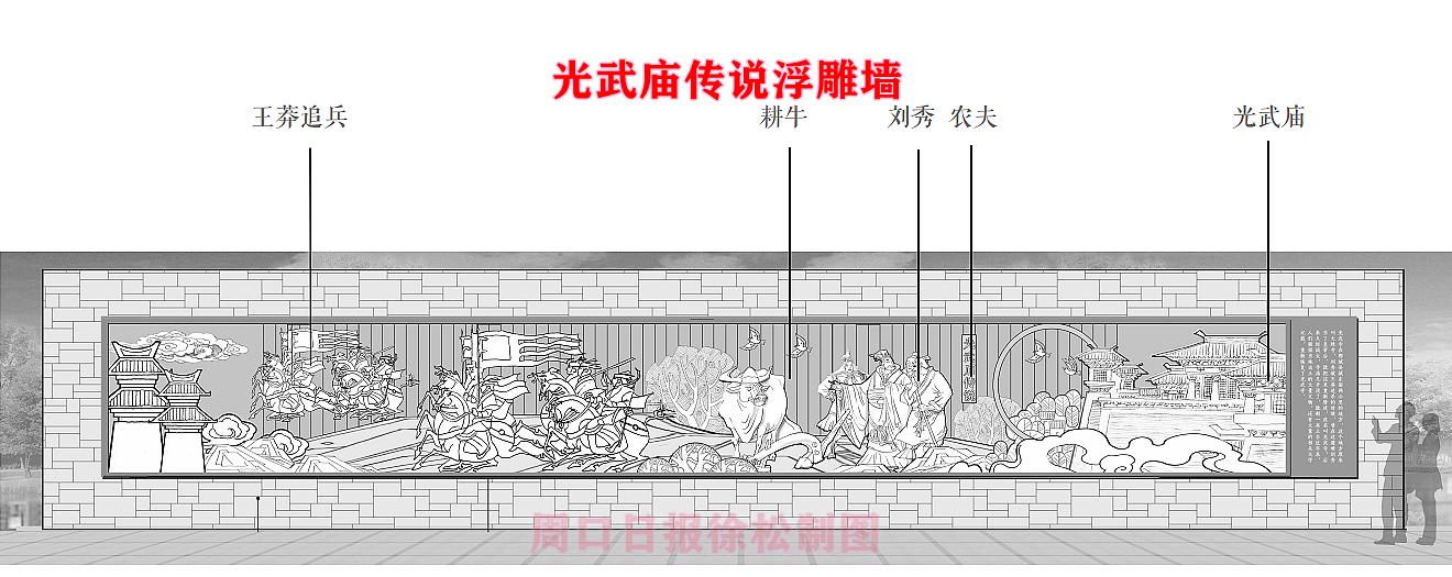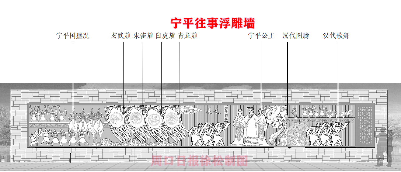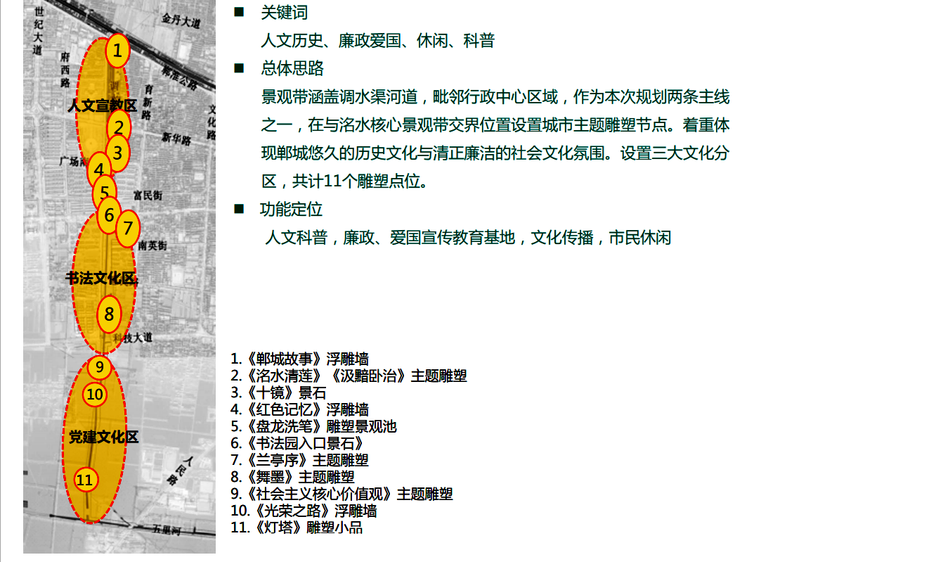 在縣委、縣政府綜合大樓東側的核心形象段,配合鄲城行政中心打造莊嚴、大氣氛圍的同時,對鄲城歷史文化進行了集中展示,包括鄲城的歷史沿革,鄲城的發展理念,歷史故事等。其中調水渠西側以現有人民廣場對應的綠地為基礎,設置了較多的歷史文化節點。如調水渠新華路橋頭北側的廉政文化廣場,講述了漢朝名臣汲黯的故事。汲黯為人耿直,直諫廷諍,親政愛民,敢于承擔責任,漢武帝劉徹稱其為“社稷之臣”。汲黯廉政廣場建設在此處更有著深遠的意義,它一方面提醒老百姓要了解歷史、敬畏先賢,同時也激勵著鄲城縣的各級黨員干部要在習近平新時代中國特色社會主義思想引領下,“不忘初心、牢記使命、廉潔奉公、一心為民”。