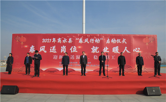 春風送崗位,就業暖人心。春節假期剛過,2月18日,商水縣舉行2021年“春風行動”啟動儀式暨企業春季用工招聘會,為企業和求職者搭建一個雙向溝通交流的平臺,讓用人單位挑選到適合企業發展的人才,也讓求職者在家門口找到適合自己的就業崗位??h委書記孔陽,縣長田林,縣人大常委會主任李德來,縣政協主席孫培忠,副縣長朱高建,縣政協副主席、工商聯主席彭發光,縣工會主席盧紅兵,縣集聚區管委會主任馬三華等出席啟動儀式。啟動儀式由朱高建主持。