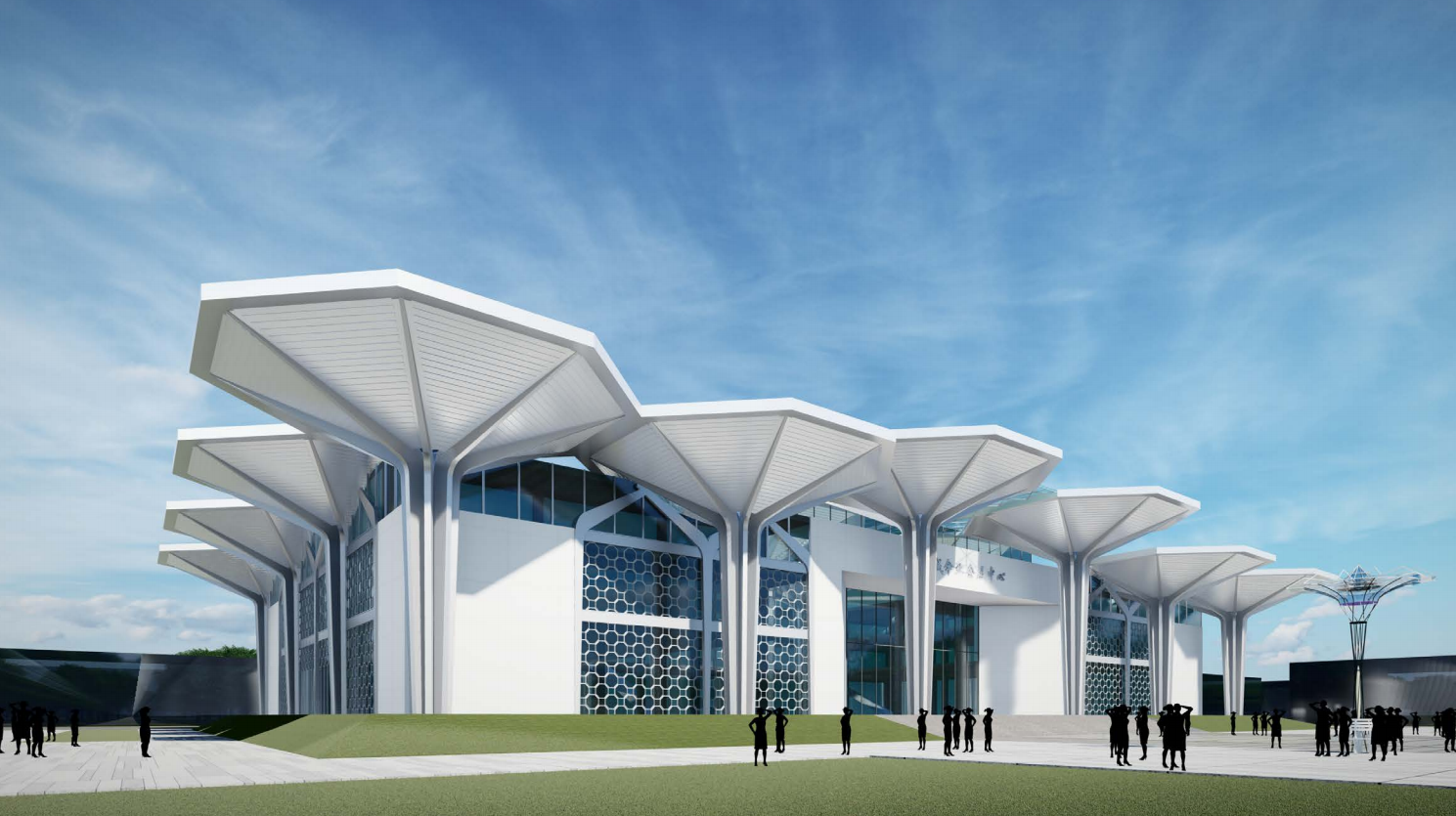 鄲城縣傘業產業園電子商務服務中心項目是鄲城縣傘業全產業鏈展銷的窗口項目、展示項目。會展中心的設計概念以“傘啟鄲興”為主題,基于對本土特色文化的深入解讀、同時結合“傘”的具體特征,提煉傘蓋、傘骨、傘柄的特殊形象為基本元素。建筑主立面以八個巨大傘形構架依次展開,巨型的尺度、新穎的造型有極強的昭示性,裝飾幕墻八邊形的單元分割也隱喻了傘蓋的造型,創新的視覺形象為傘業產業園增加了新的注解。會展中心整體的建筑風格充分展示了鄲城傘業產業園的核心價值,形成獨具特色的地標形象。