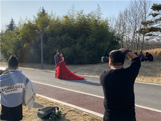 優美的景色不是市民享受春光的好去處,也是拍攝婚紗照的好地方。“老婆靠老公近一點、再近一點,微笑、嗯不錯。”一對新人正在拍婚紗照,紅色的婚紗與自然的風景融在一起,盡顯新娘的美麗。在植物園里,拍一組森系風格的婚紗照很是漂亮,春風將“調色板”打翻,一對新人的甜蜜愛情就這樣被定格在這春天里。