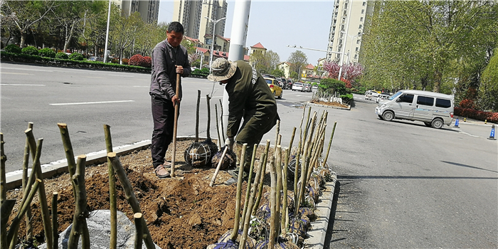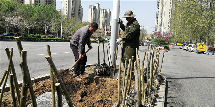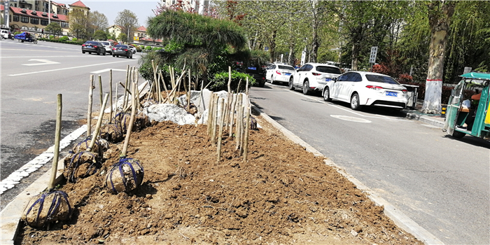 仲春時節,我市積極打造街頭游園、口袋公園,增加市民休閑游樂場所。圖為園林工人正在施工。②7