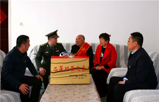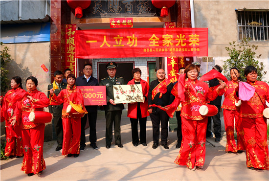 李峰說:“一張立功喜報,不僅是軍人榮譽的象征、成長進步的見證,也承載著軍人家屬的期盼與慰藉。功臣是實現強軍興軍目標的尖兵,他們在部隊建功立業,我們力所能及服務保障好他們的家人,積極在全社會營造起‘功臣受愛戴、軍人受尊崇、軍屬受尊敬’的氛圍。”為此,鹿邑縣人武部積極構建軍人軍屬榮譽體系,每逢重大節日,都要協調地方黨委、政府開展為現役軍人和軍屬送喜報,掛功臣匾、光榮牌等活動,通過活動激勵等形式,讓軍人軍屬享有更多的“專屬榮光”,努力營造“一人參軍,全家光榮;一人立功,全村光榮”的濃厚氛圍,更加堅定了軍屬支持子女獻身國防的決心,進一步激發了鹿邑籍官兵獻身軍營、報效祖國的積極性。②9