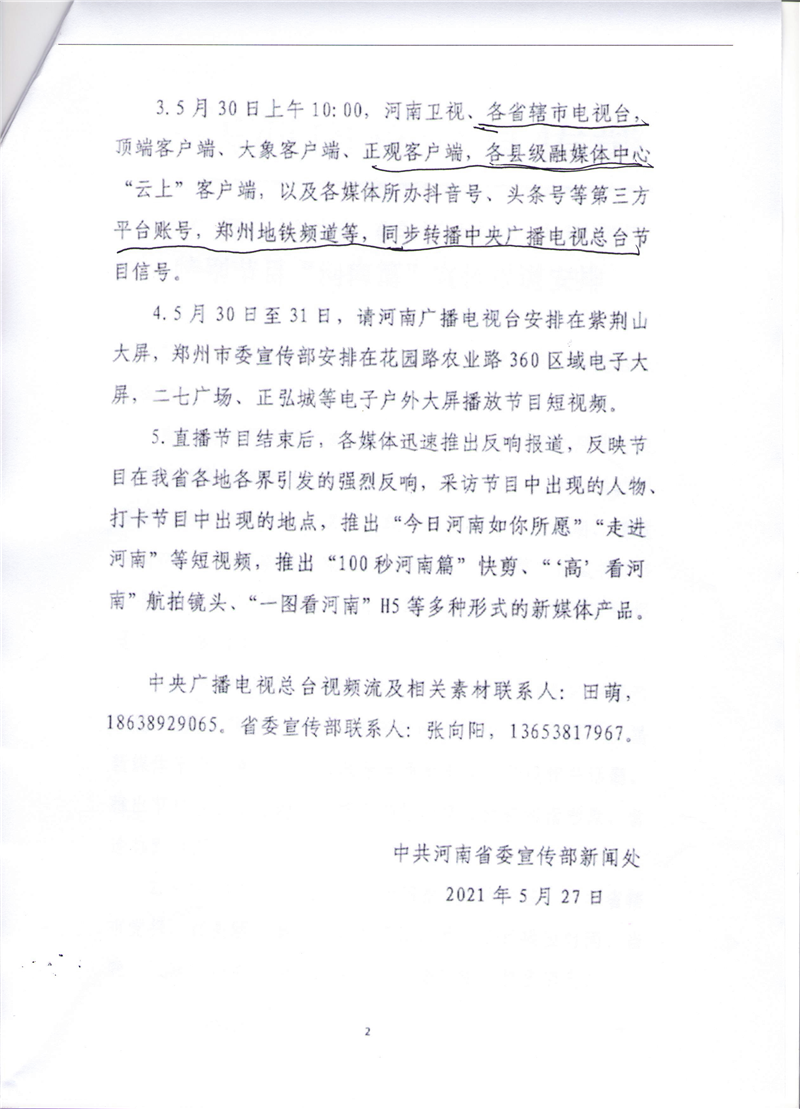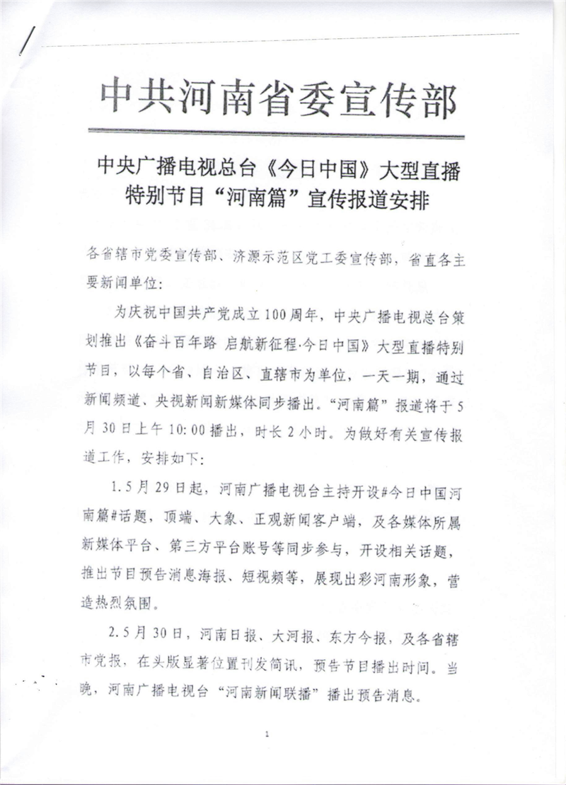 中央廣播電視總臺《今日中國》大型直播特別節目“河南篇”宣傳報道安排