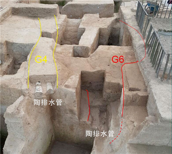 之后,考古隊(duì)新發(fā)掘出四組龍山時(shí)期陶排水管道,其中兩組位于南城門(mén)附近。2019年,又在城內(nèi)高臺(tái)式排房的室外墊土之下發(fā)現(xiàn)兩組東西向敷設(shè)的陶排水管道。這些陶排水管道,向西聯(lián)通這座古城的中軸線(xiàn)。這些陶排水管長(zhǎng)35到45厘米,表面裝飾籃紋、繩紋和方格紋,兩端有子母口,節(jié)節(jié)套合,構(gòu)思精巧,它們或縱穿城墻基礎(chǔ),或沿排房建筑的外緣平行分布,兩端有進(jìn)、出水口,與城內(nèi)的東西或南北向的排水溝相連通,是目前國(guó)內(nèi)發(fā)掘的年代最早、最為完備的城市排水系統(tǒng),對(duì)于研究我國(guó)早期城市的水資源管理系統(tǒng)具有在重要的意義。從發(fā)現(xiàn)的陶排水管道的情況上我們可以大致推測(cè),平糧臺(tái)城址可能受到水患,當(dāng)時(shí)先民始終關(guān)心如何把城內(nèi)積水排到城外。