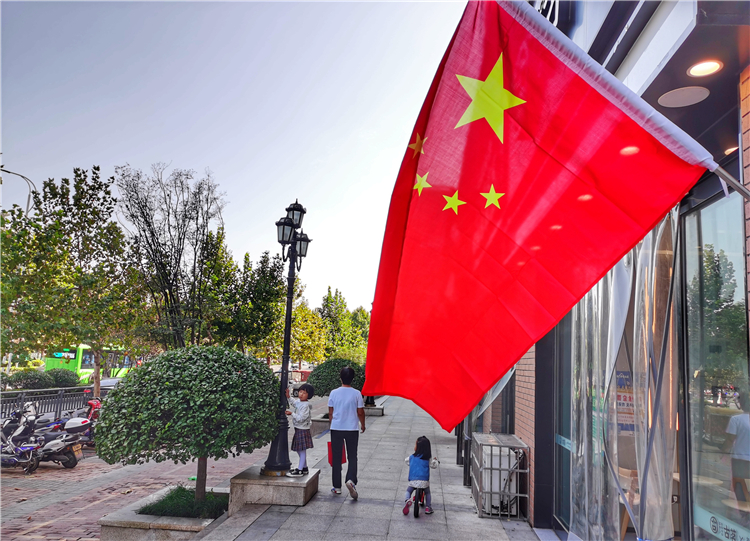 9月30日,市區(qū)臨街商鋪門前五星紅旗隨處可見(jiàn),紅旗隨風(fēng)飄揚(yáng),將街道裝扮一新,喜迎國(guó)慶節(jié)的到來(lái)
