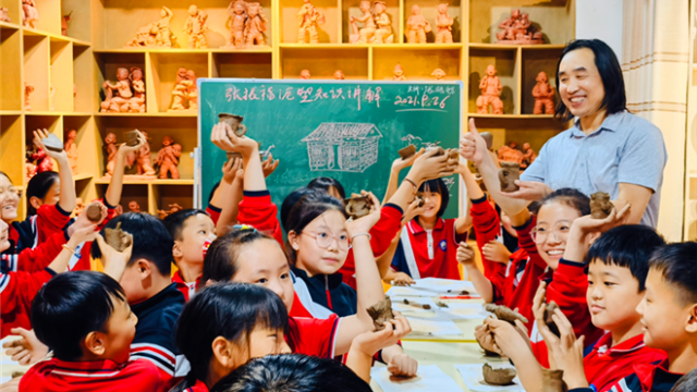 “這作品形象逼真,太生動了。”昨日,在張振福鈞瓷泥塑藝術館,同學們被一件件憨態可掬的泥塑作品驚呆了,看到活潑、歡快、形態各異的泥塑兒童造型,大家紛紛稱贊。