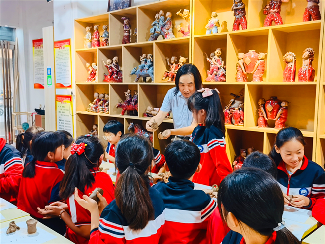 中小學生國慶節弘揚非遺文化 學習張振福泥塑鈞瓷技法