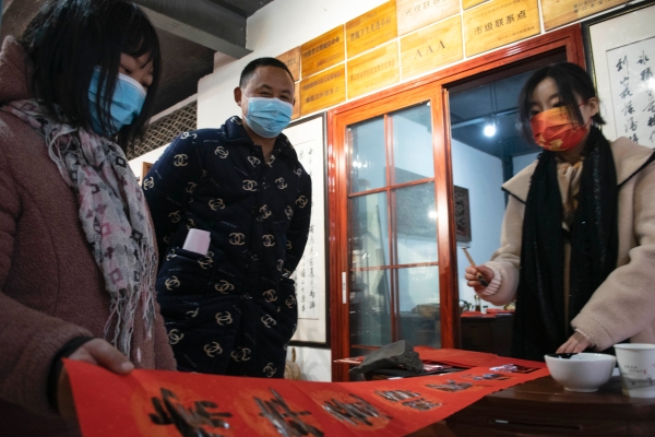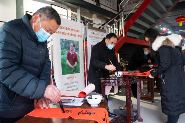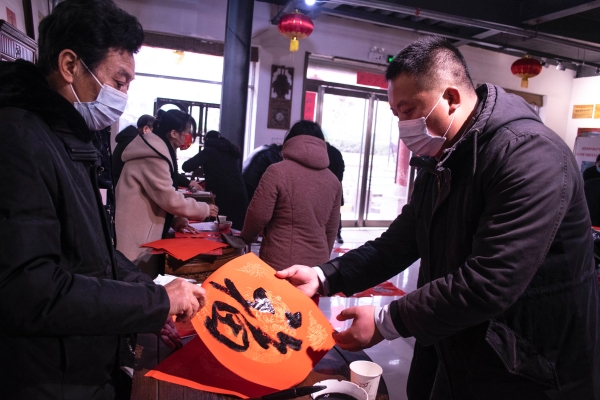 1月28日上午,市民間文藝家協會、市燈謎學專委會聯合華威民俗文化博物苑邀請霍云亭、寇成義、李國彬、靳玉峰、陳濤、游富華、何南、軒敬賢、李雯云等書法家,為市民寫春聯送祝福。窗外雪花飛舞,屋內紅紙鋪展,老中青書法家揮毫潑墨,表達新年祝福。