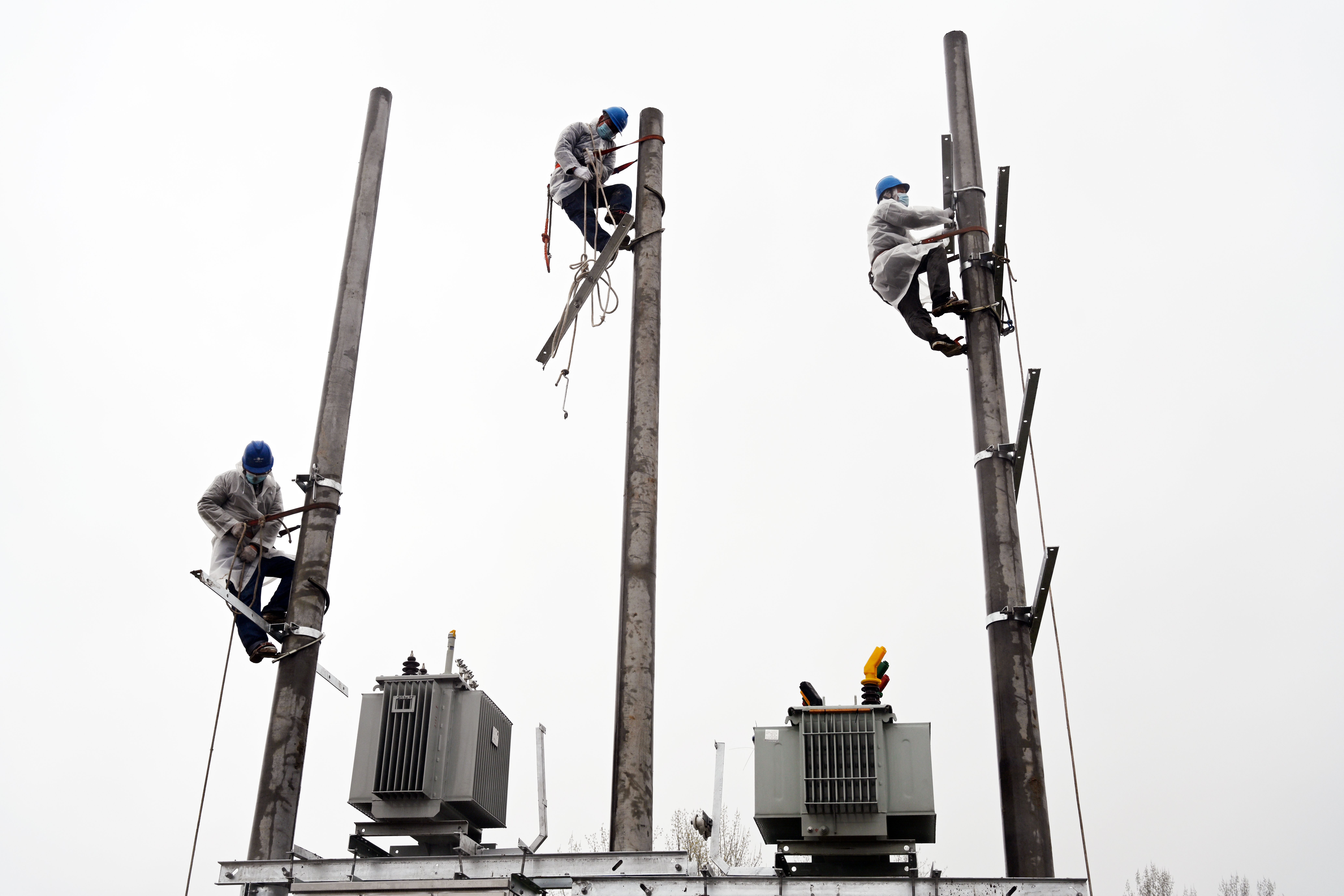 3月25日,在太康縣北環路核酸檢測方艙和隔離方艙建設現場,國網太康縣供電公司工作人員正冒雨施工為其提供電力保障。