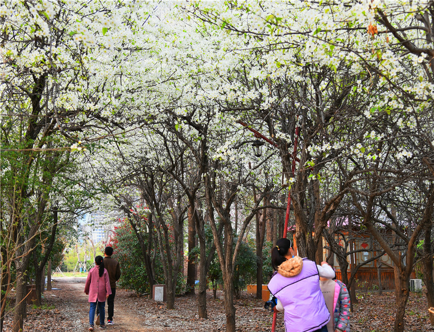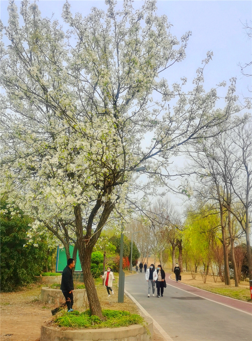 3月26日,周口市天氣晴好,植物園內岸柳青青、鶯飛草長。園內的梨花正是盛開時,不少市民在此駐足觀賞拍照。②8