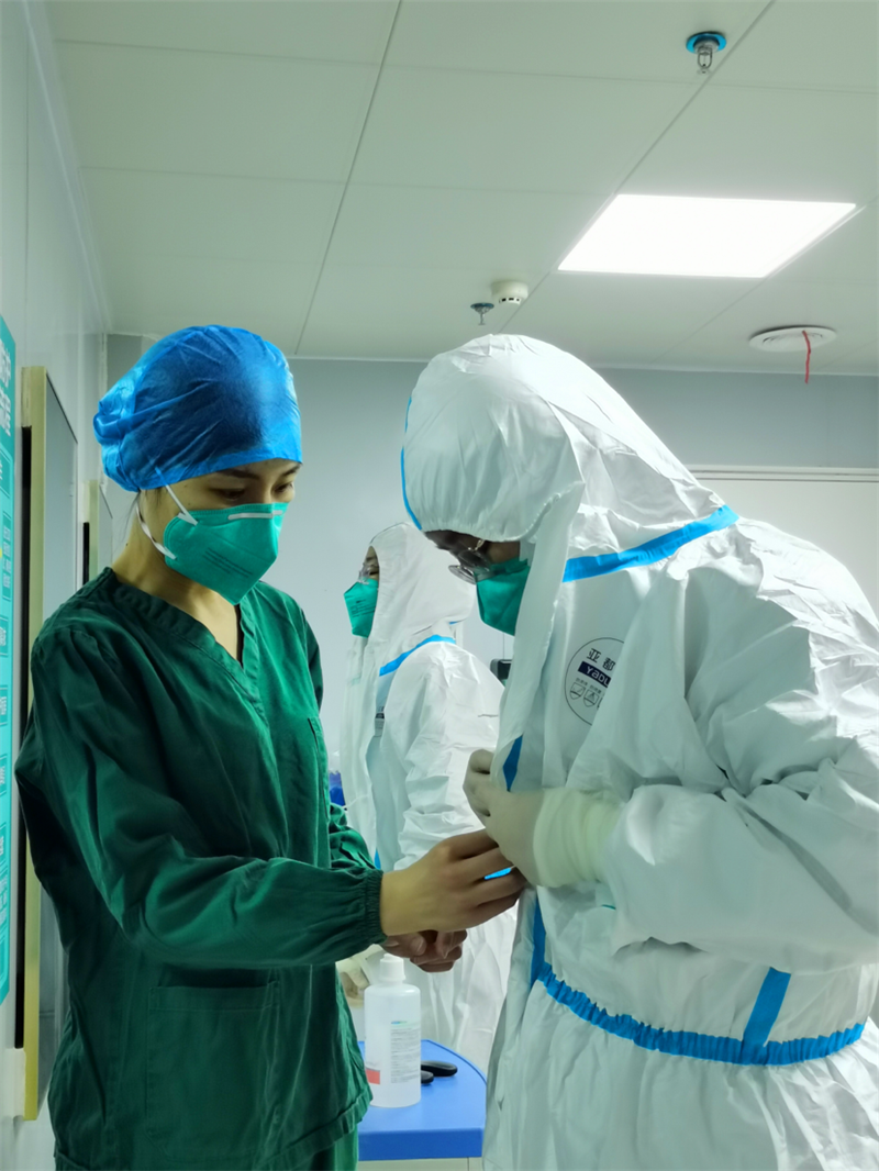 讓一線醫(yī)護人員在安全的環(huán)境工作和做好自身防護是“感控人”最重要的使命。劉琦嚴防死守,盯好隊員的每一個動作,有污染可能的及時作出提醒糾正,在病房操作治療過程中,及時監(jiān)督和提醒每一位隊員的手衛(wèi)生執(zhí)行,對遇到的問題當場解決。