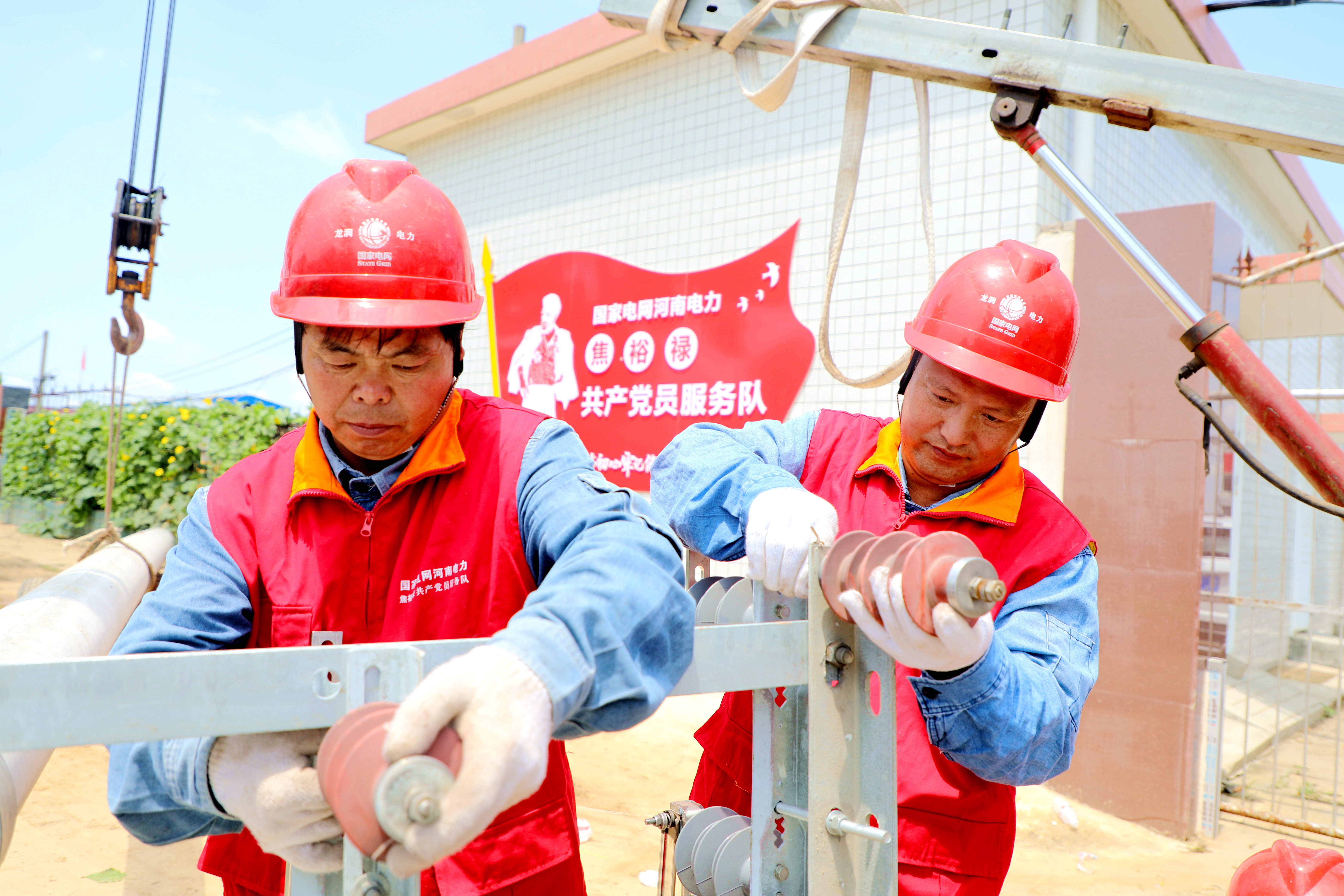 在35千伏址坊變電站10千伏灣張線出線倒桿緊急搶修現場,焦裕祿共產黨員服務隊沖在最前線,戰高溫、斗酷暑,將原電桿位置遷移,在安全地點重新立桿接線,高效完成牽引、挖坑、立桿、填土、鞏固、緊線等搶修工序。經過連續奮戰,7月26日20時06分因災停電線路全面恢復供電。③9