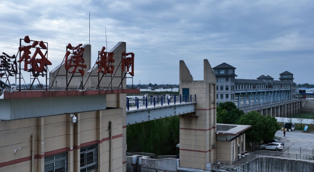 9月24日,豫貨出海、“周”向世界——周口航運出海大型異地采訪活動采訪組B組沿江淮運河南下,一路上攬渡槽、臨派河、經巢湖閘,再沿裕溪河左岸大堤下行,經過一道河灣后,一座高大的建筑如臥龍一般橫跨裕溪河上。