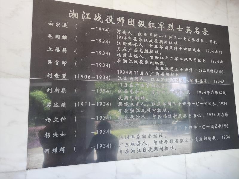 離開烈士英名長廊,記者攀登了184級臺階來到了山頂紀念碑碑亭。在高達34米的紀念碑亭內,記者意外發現,里面收錄有湘江戰役期間師團級紅軍烈士英名錄碑刻。