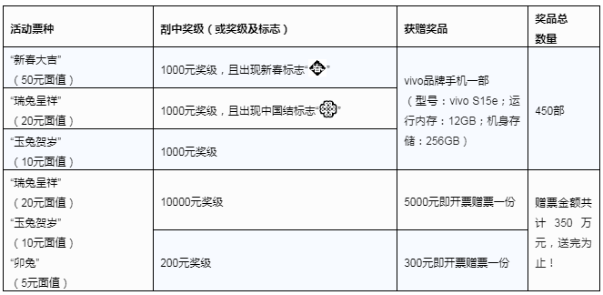 活動期間,購彩者在我省任一體彩銷售實體店購買指定活動票種,若單張彩票刮中符合獎勵條件的獎級(或獎級及標志),經實體店終端兌獎設備(IVT或BCR)成功完成獎金兌付及促銷兌獎掃描后,另可獲贈相應的獎品。獎品數量有限,送完為止,詳見下表: