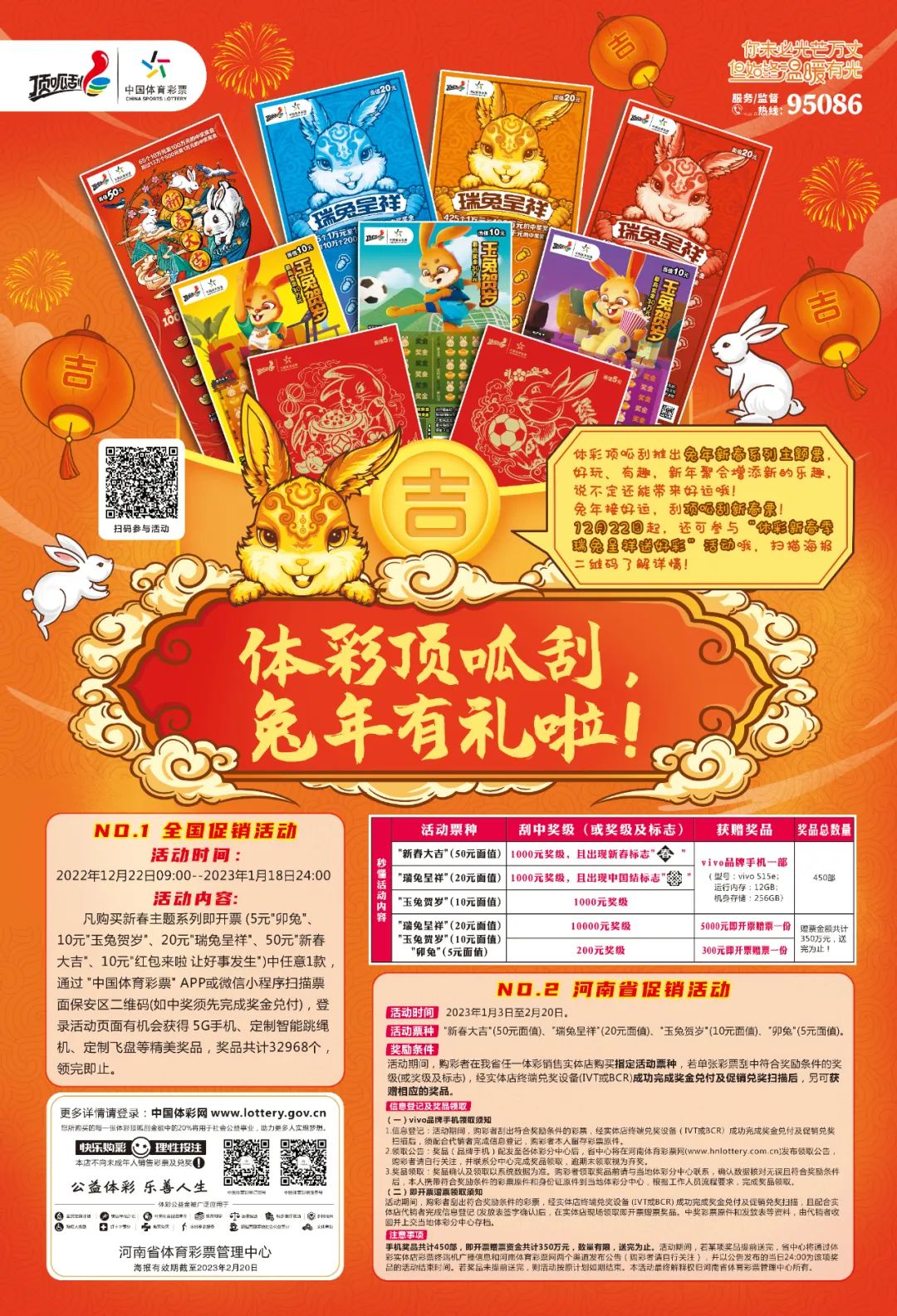 2.“體彩新春季”全國促銷活動細則詳見“中國體育彩票”微信小程序或“中國體育彩票”APP活動頁面,或登錄中國體彩網查詢相關信息。
