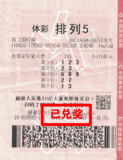中獎當天,購彩者和往常一樣來到店里,對著店內的歷史開獎號碼研究了一會兒,果斷選擇了定位復式進行投注。據悉,中獎者張先生(化名)多年來養成購買體育彩票小盤玩法排列型游戲的習慣,積累了豐富的購彩經驗,對該玩法有自己獨到的分析方法和見解,善于利用定位復式進行購買,購彩多年,體育彩票排列型玩法給他帶來了多次中獎驚喜和美好的購彩體驗。23087期,在經過自己的仔細分析和判斷后,張先生第一位選定123,第二位選定23,第三位選定689,第四位選定27,第五位選定13,組合成為一張144元的排列5定位復式票,巧妙運用自己獨特的選號技巧,幸運命中當期排列5一等獎。