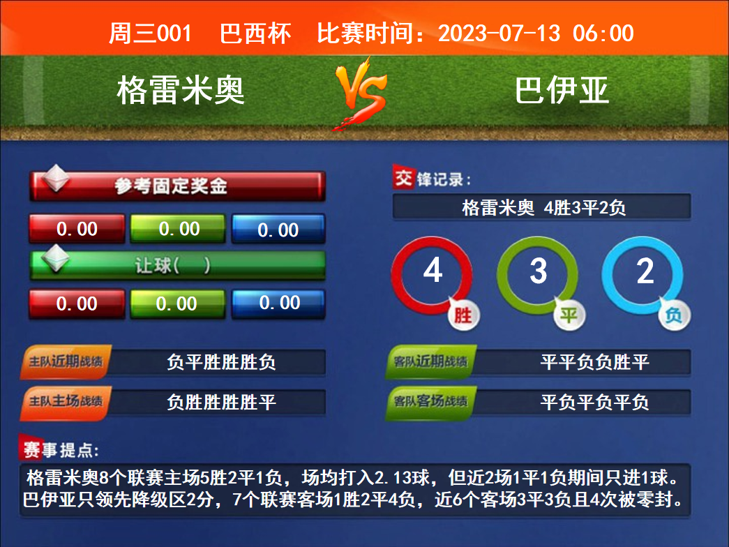 比賽時間:2023-07-13 06:00賽事提點:格雷米奧8個聯賽主場5勝2平1負,場均打入2.13球,但近2場1平1負期間只進1球。巴伊亞只領先降級區2分,7個聯賽客場1勝2平4負,近6個客場3平3負且4次被零封。